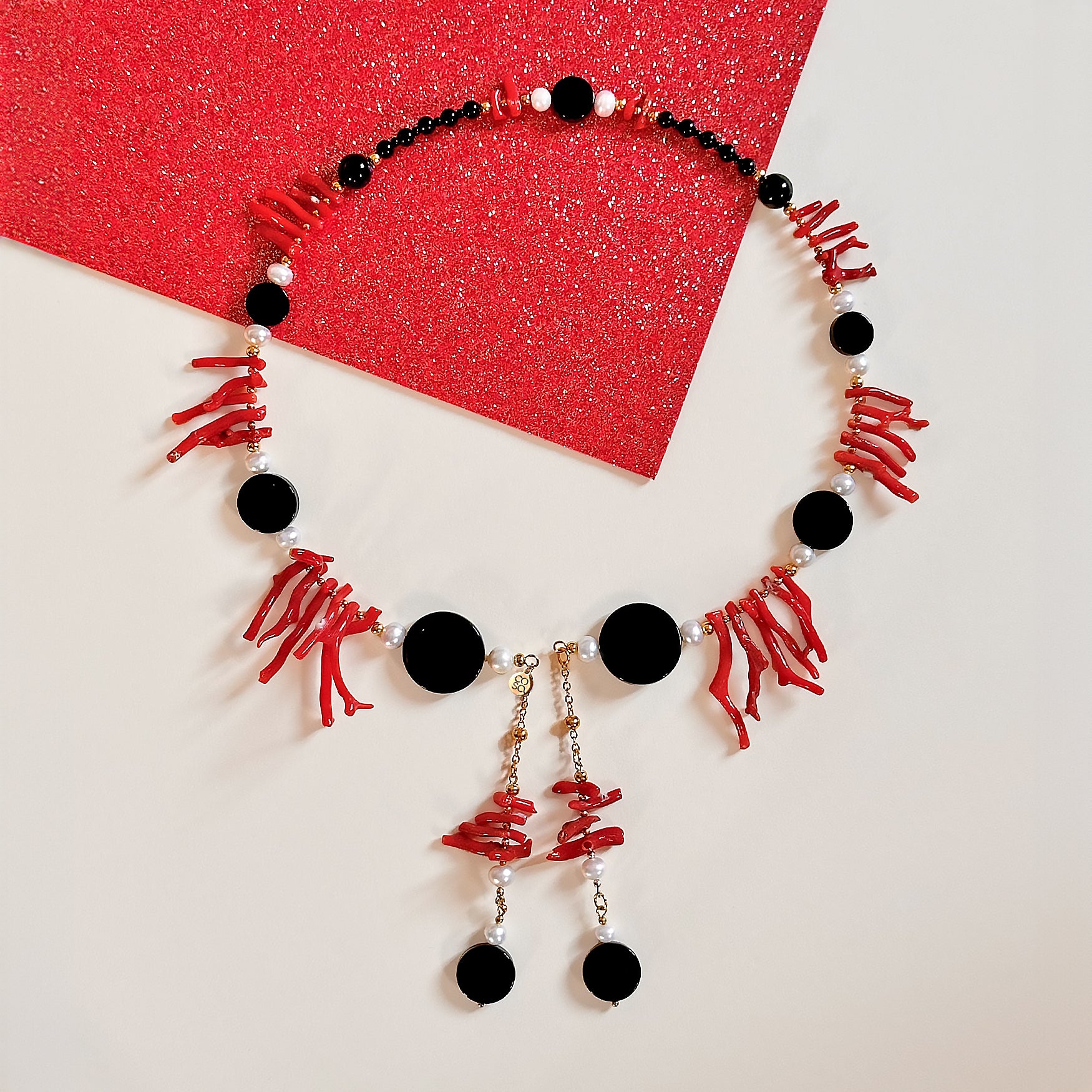 Collana dal design artigianale, realizzata a mano con coralli, perle naturali e l'agata nera. Ogni pezzo è impreziosito da gemme dalle forme irregolari, che rendono ogni creazione unica e originale — un accessorio senza tempo che celebra la tua individualità. Quantità limitata.