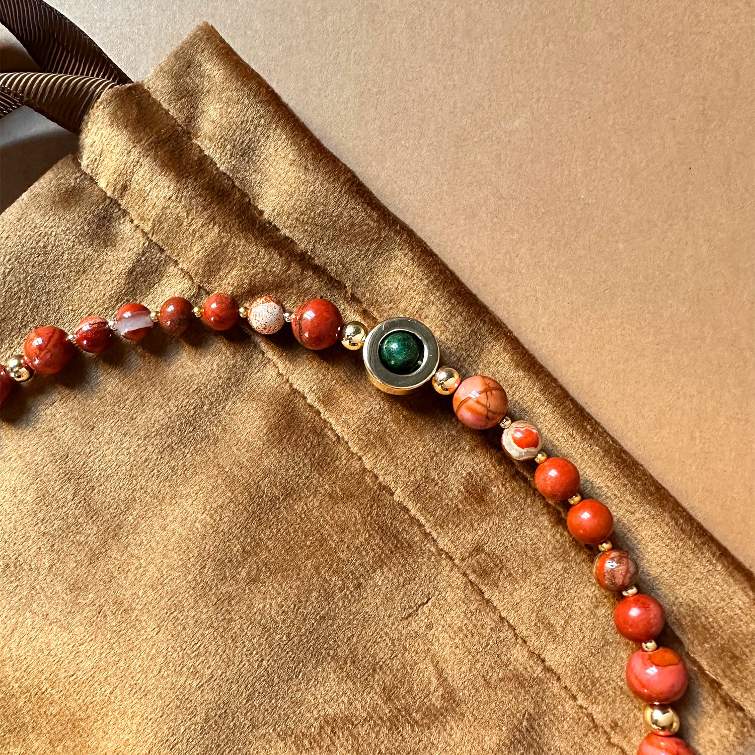 Collana dal design artigianale, realizzata a mano con pietre dure naturali Red Jasper e Azurmalachite. Ogni pezzo è impreziosito da gemme dalle forme irregolari, che rendono ogni creazione unica e originale — un accessorio senza tempo che celebra la tua individualità.