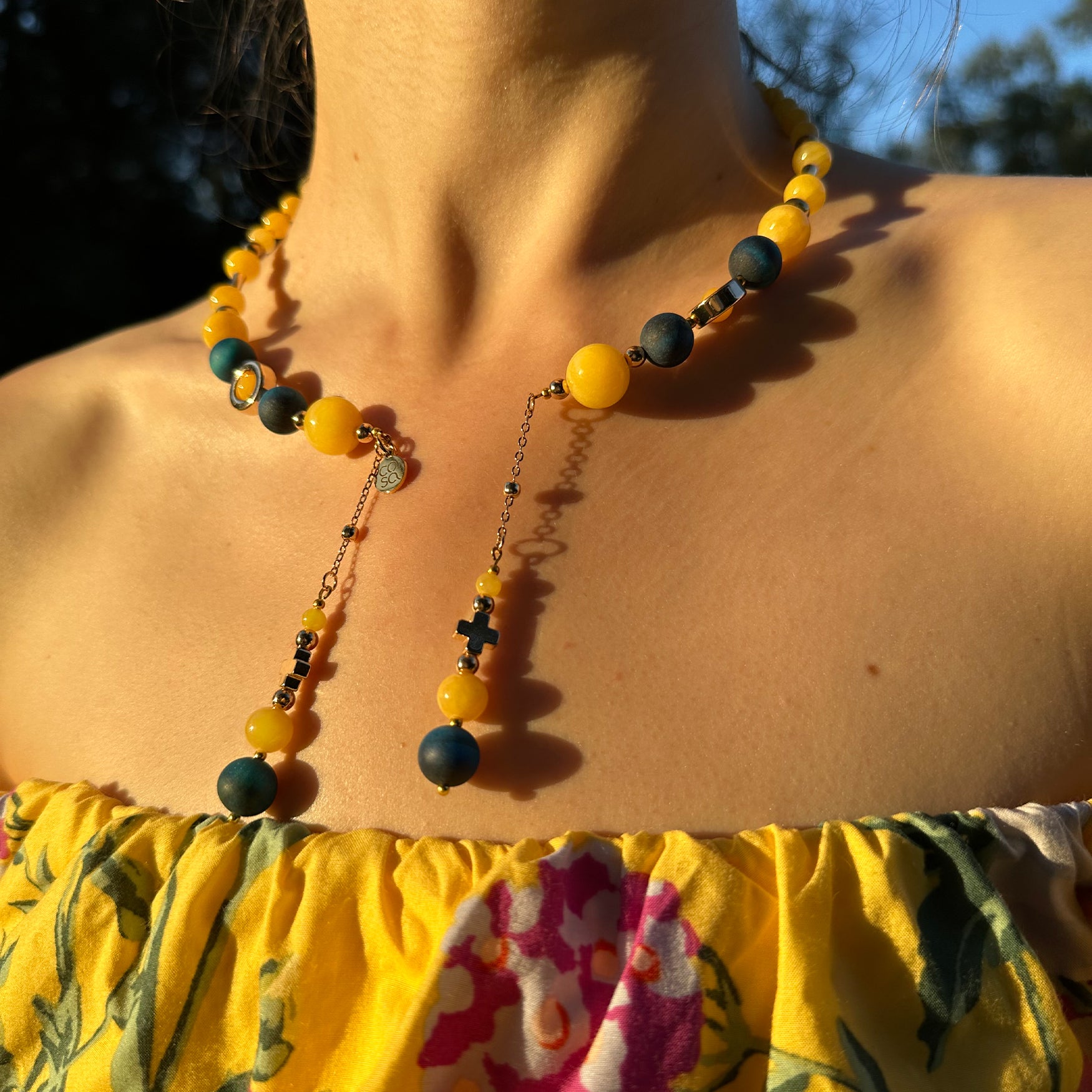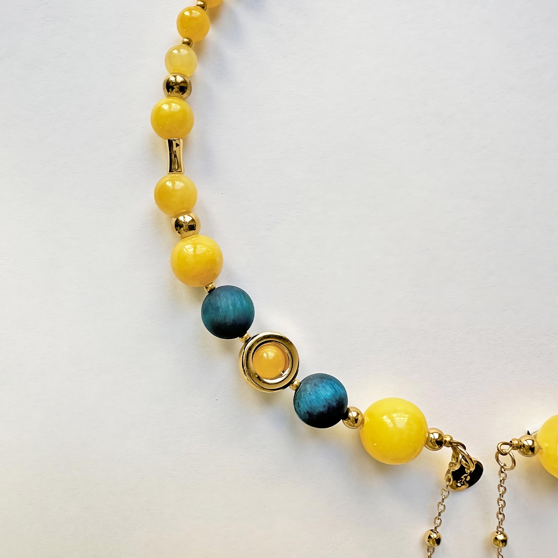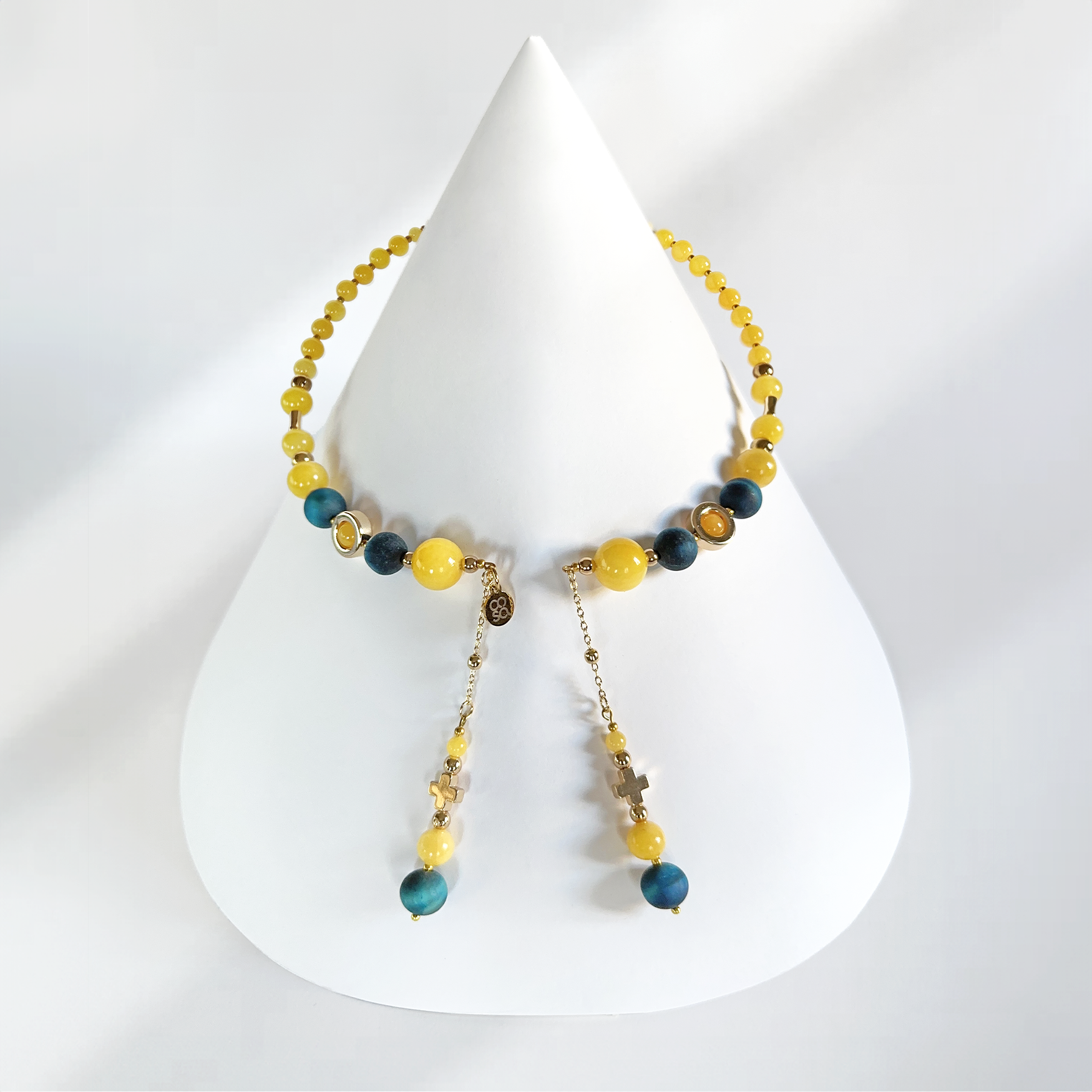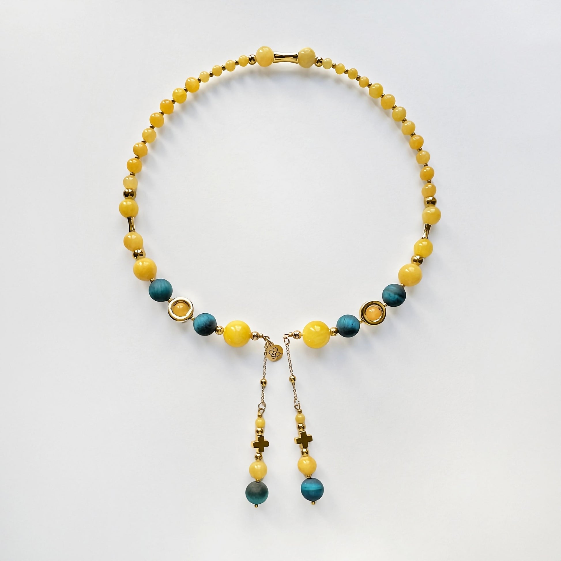 Collana dal design artigianale, realizzata a mano con l'occhio di gatto (una varietà opaca di quarzo) e quarzo giallo tinto. Ogni pezzo è impreziosito da gemme dalle forme irregolari, che rendono ogni creazione unica e originale — un accessorio senza tempo che celebra la tua individualità. Quantità limitata.