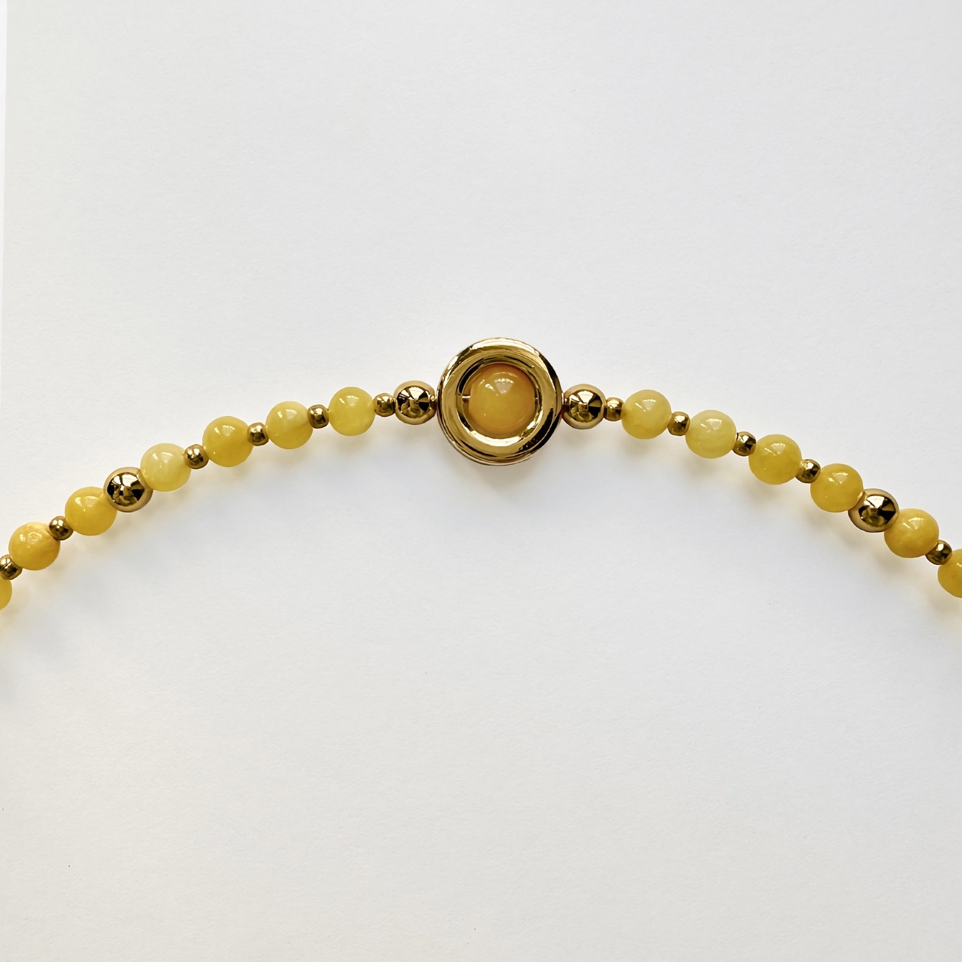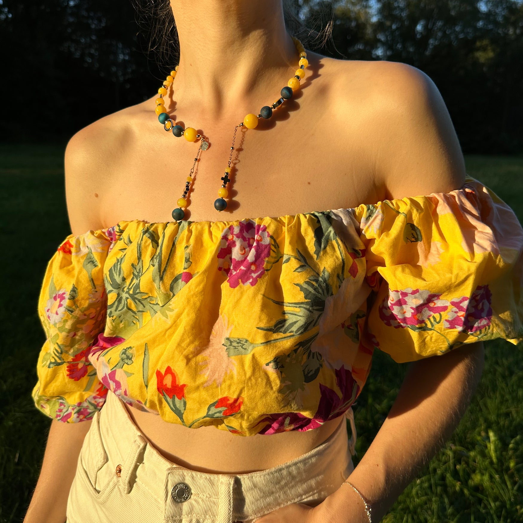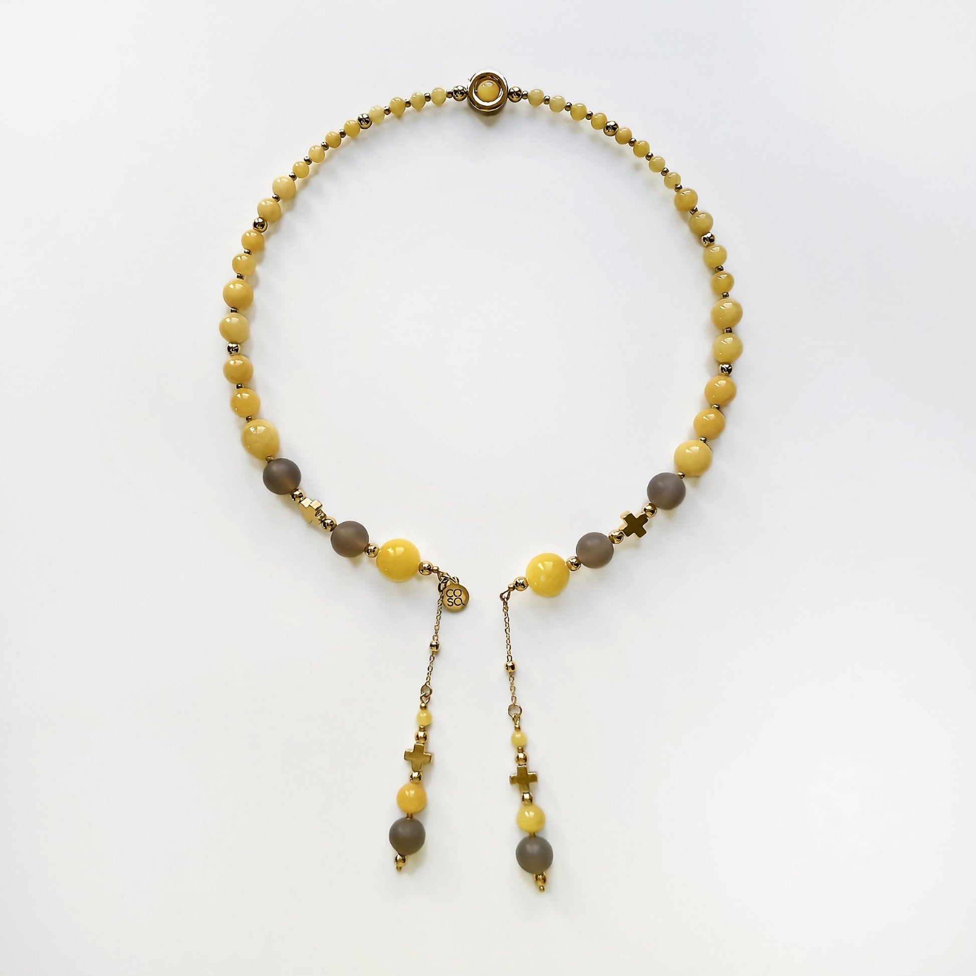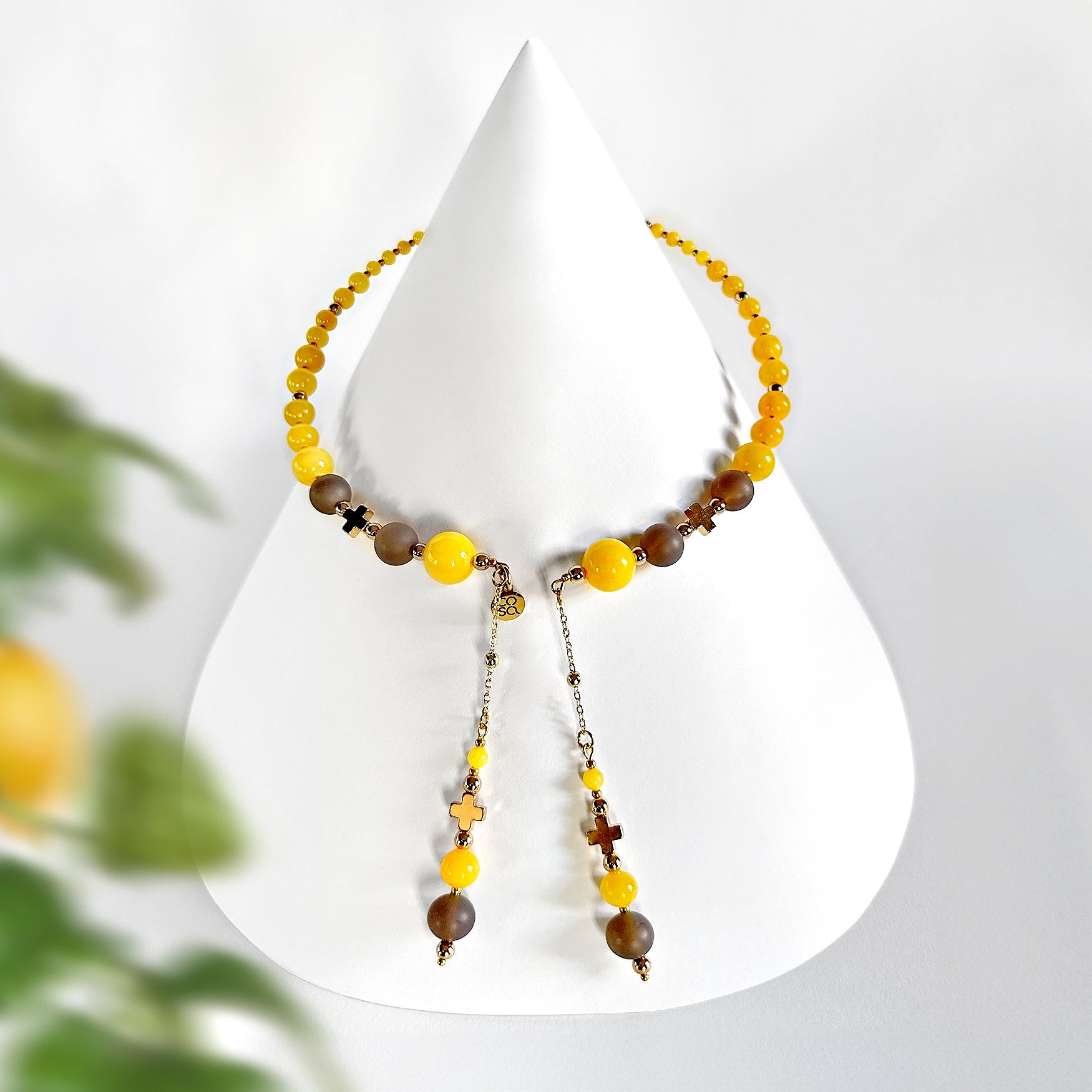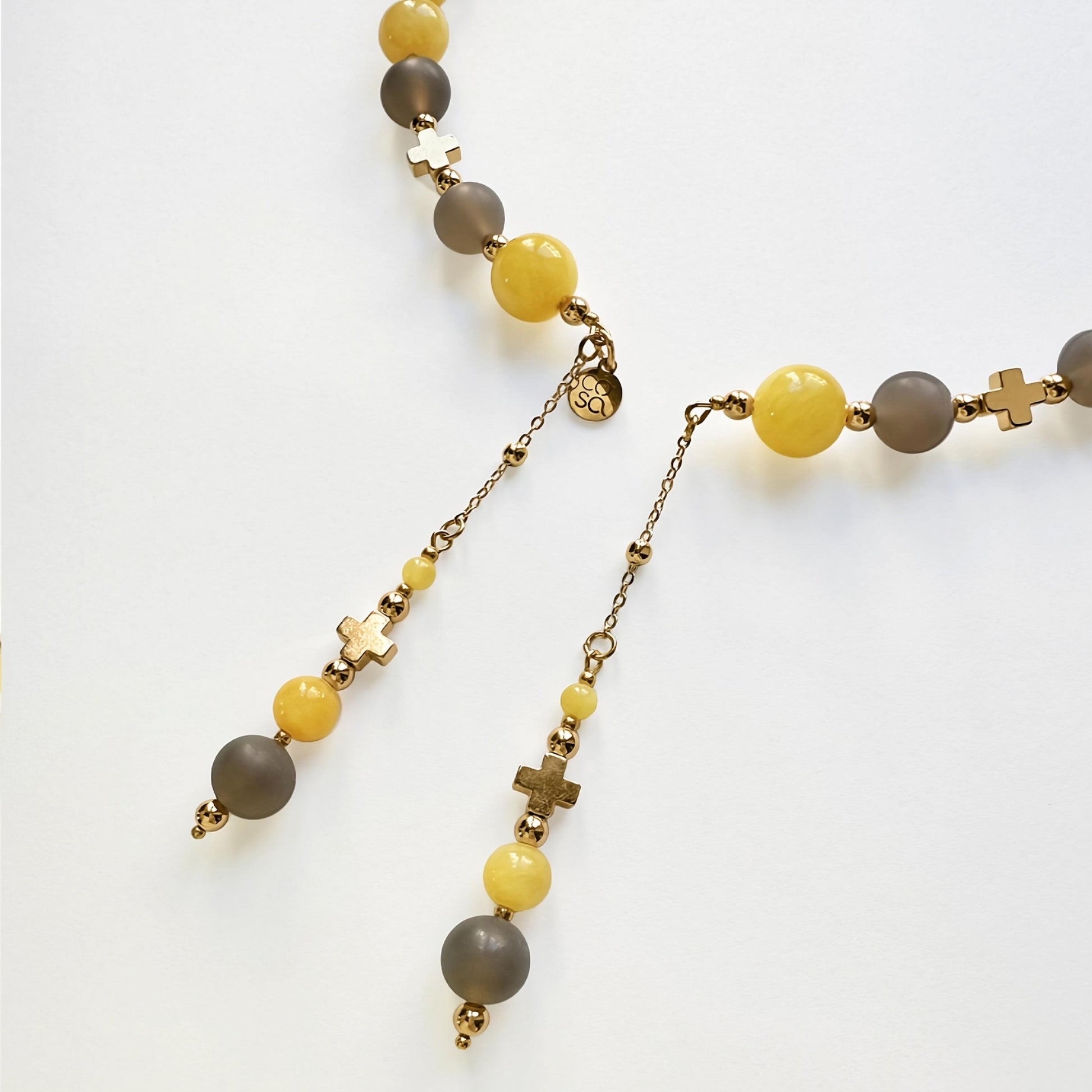 Collana dal design artigianale, realizzata a mano con l'occhio di gatto (una varietà opaca di quarzo) e quarzo giallo tinto. Ogni pezzo è impreziosito da gemme dalle forme irregolari, che rendono ogni creazione unica e originale — un accessorio senza tempo che celebra la tua individualità. Quantità limitata.