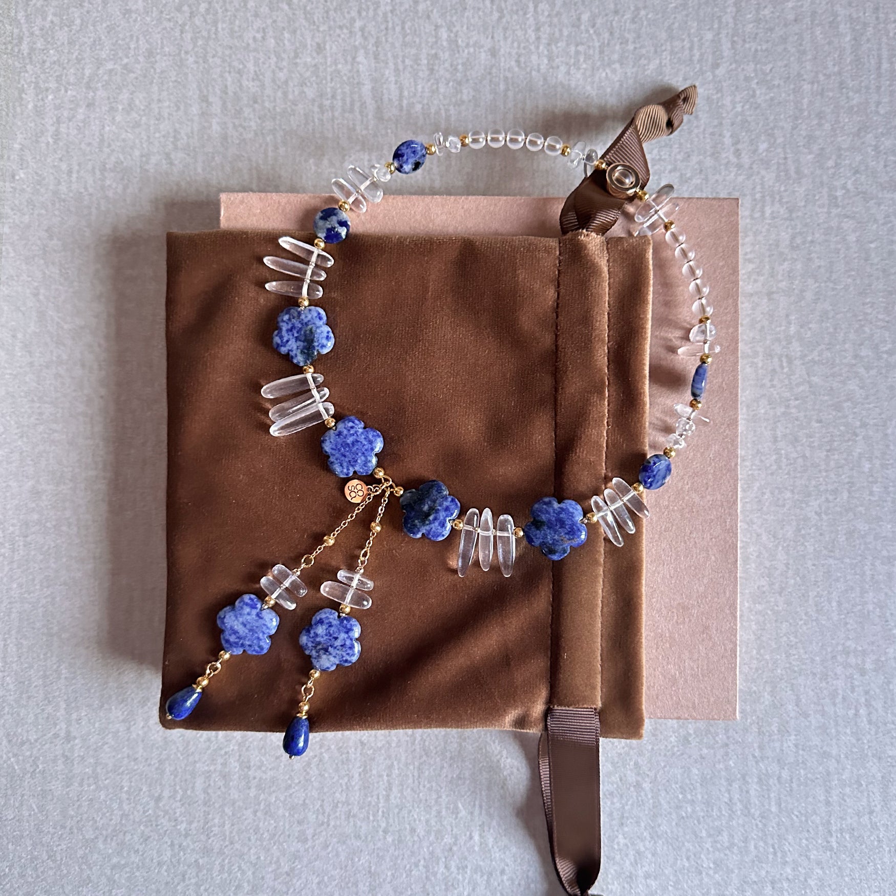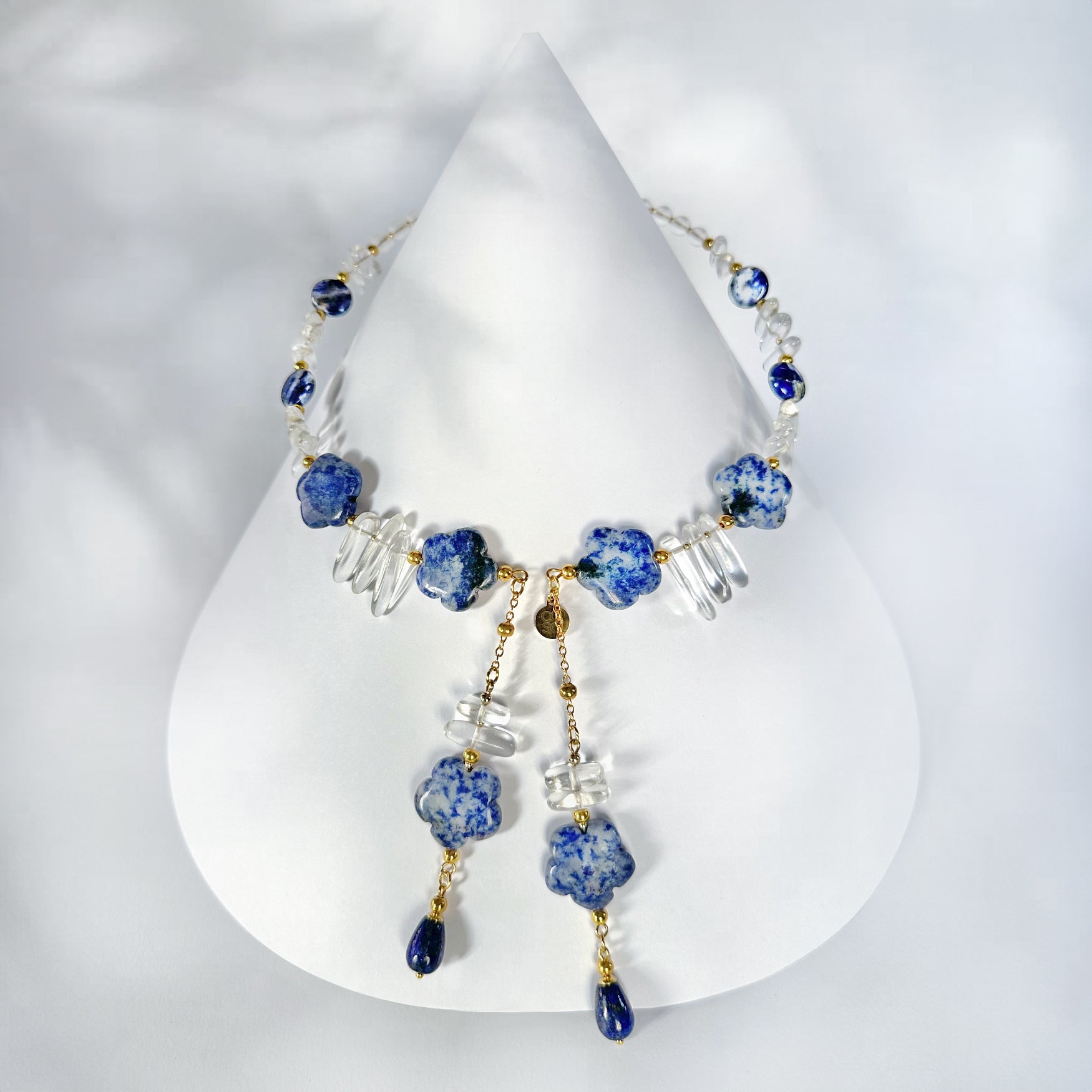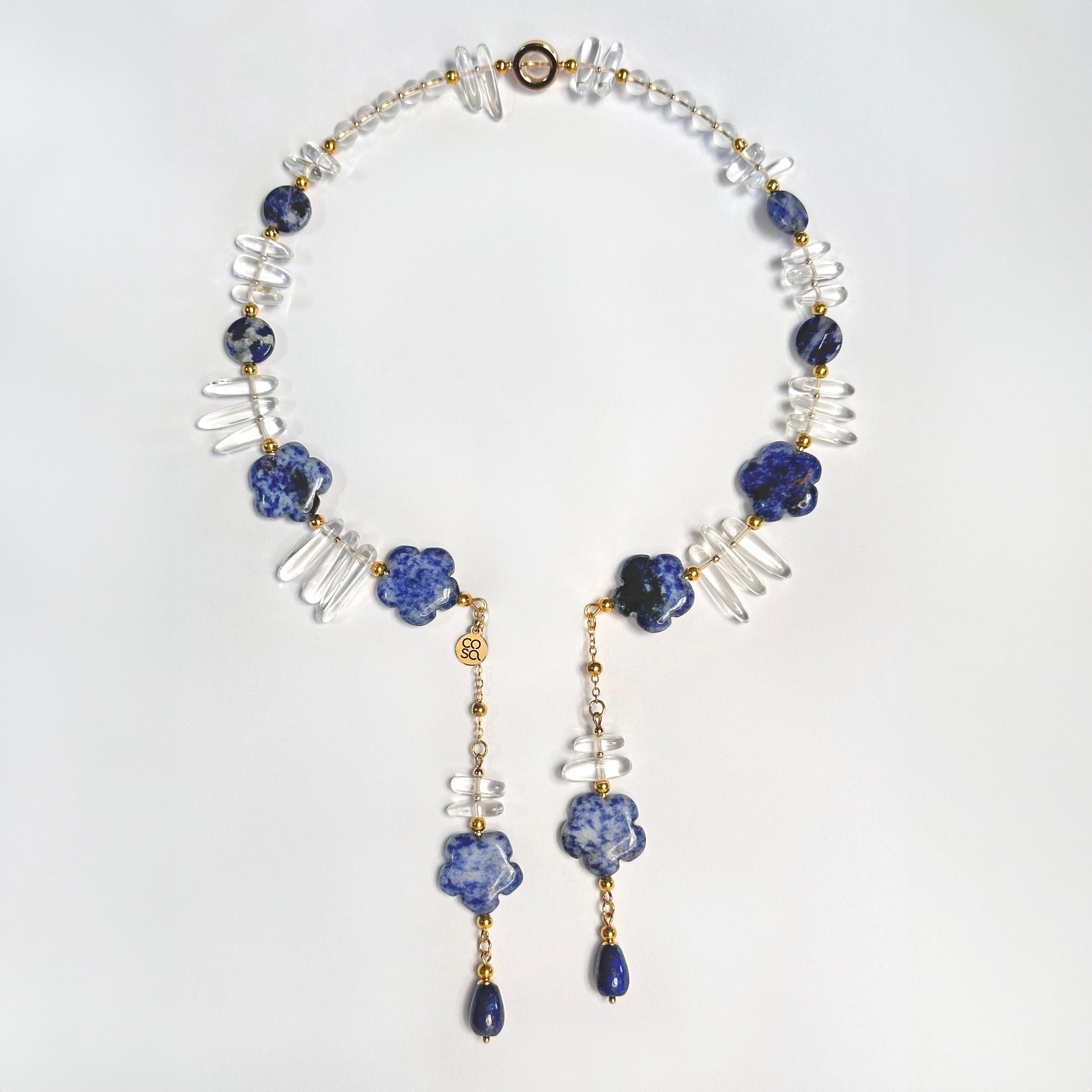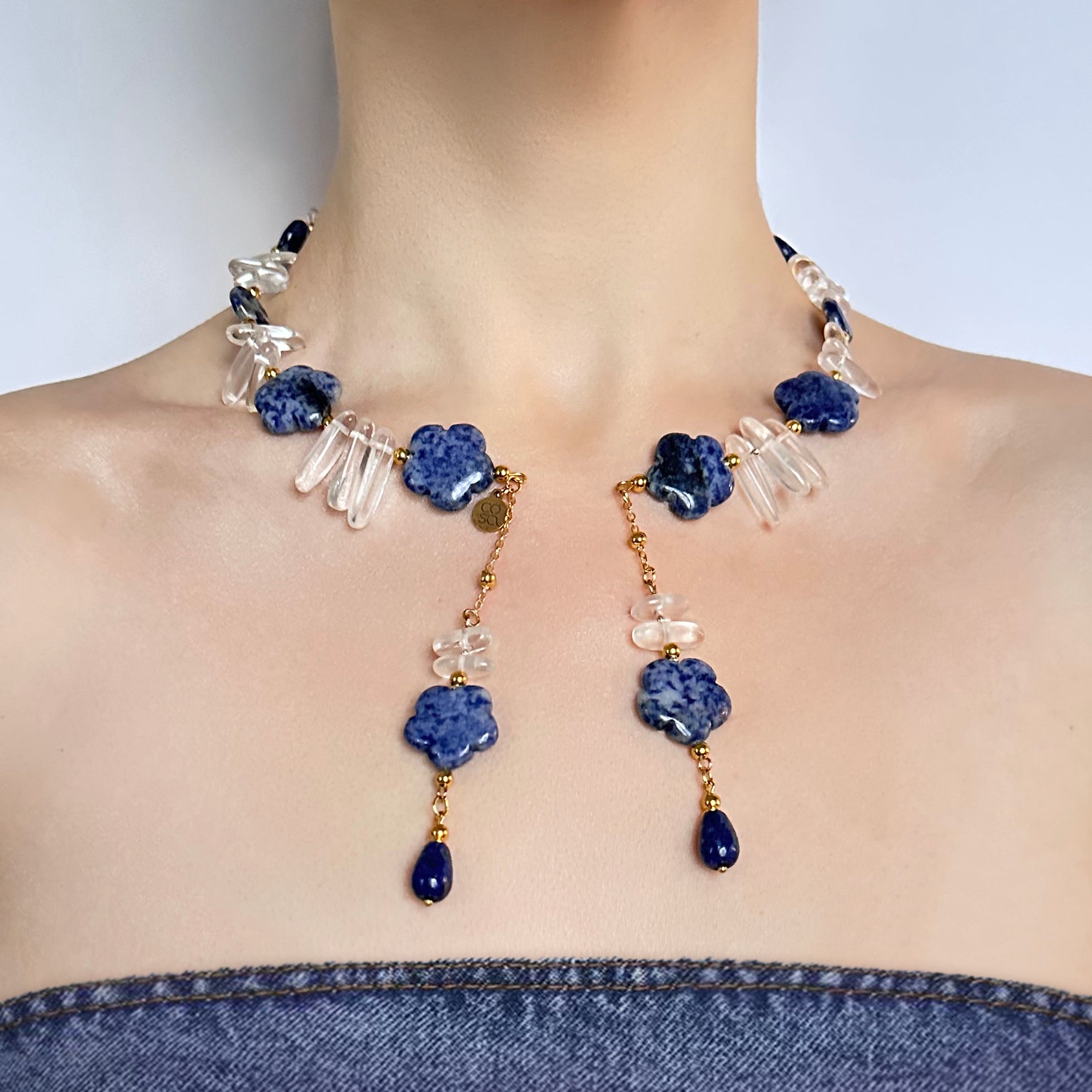 Collana dal design artigianale, realizzata a mano con Sodalite, Lazurite, cristalli di quarzo ialino trasparente. Ogni pezzo è impreziosito da gemme dalle forme irregolari, che rendono ogni creazione unica e originale — un accessorio senza tempo che celebra la tua individualità. Quantità limitata.