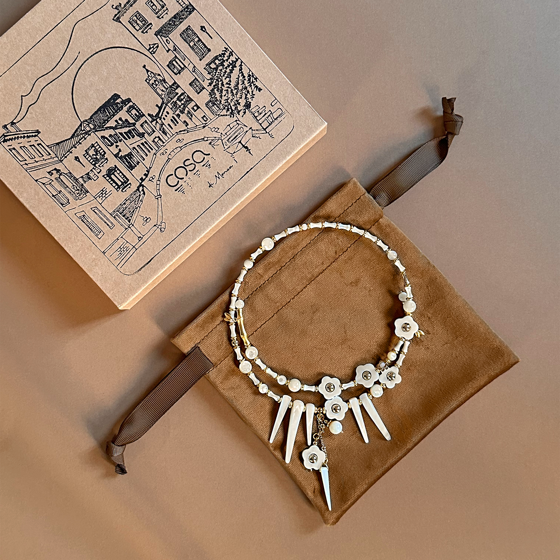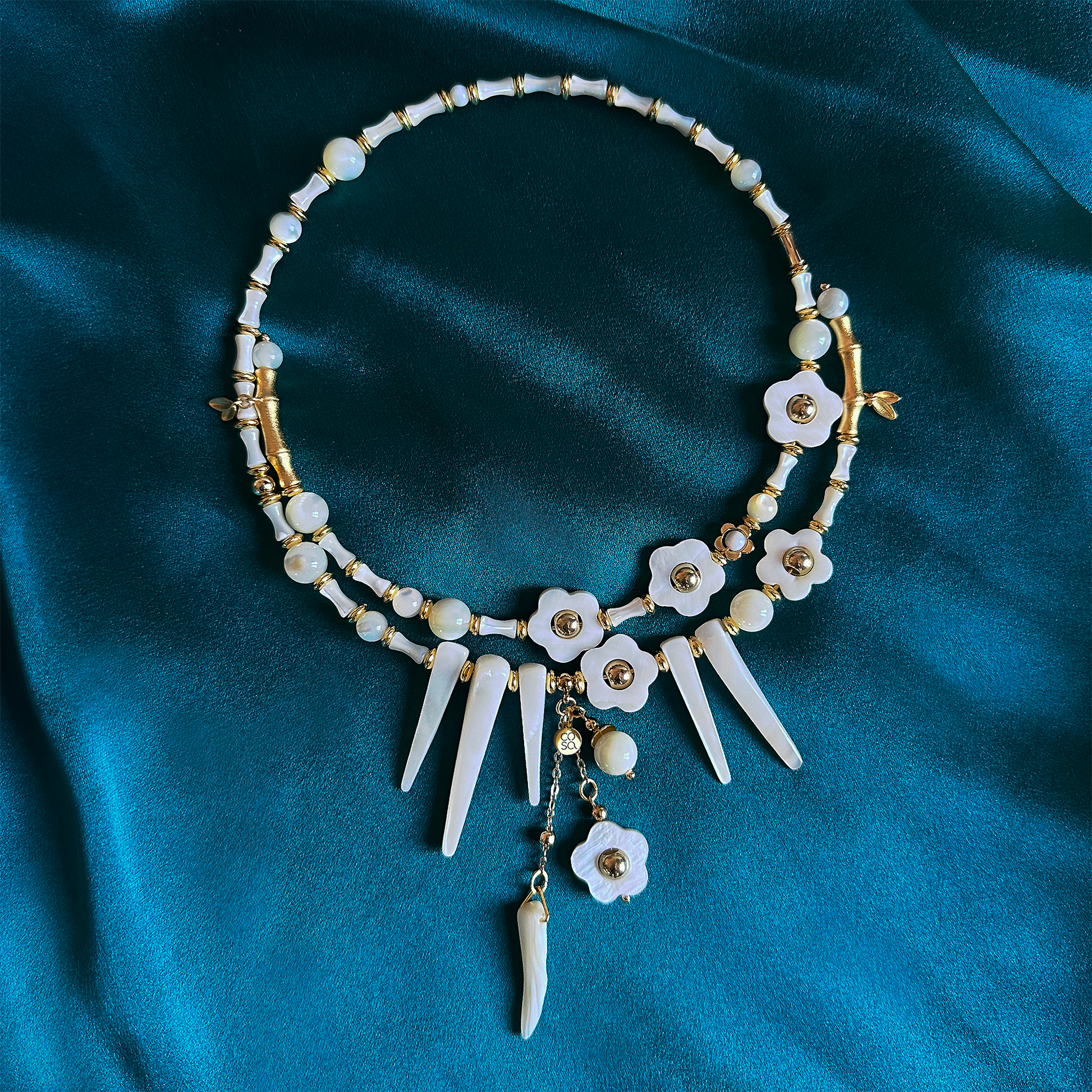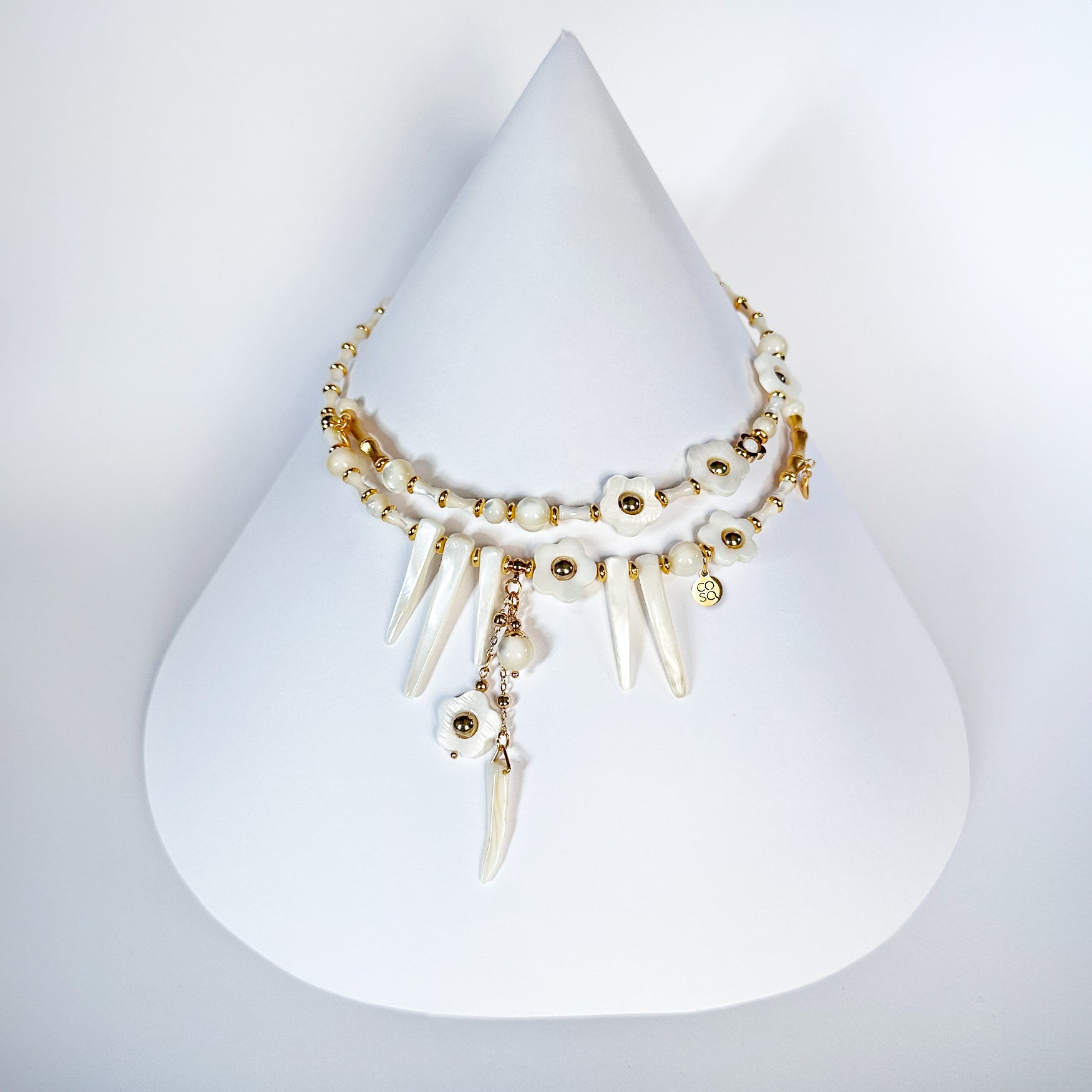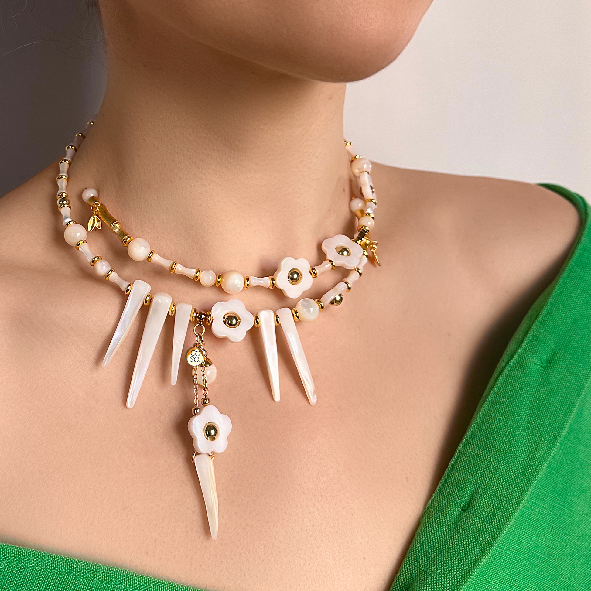 Collana dal design artigianale, realizzata a mano con madreperla. Ogni pezzo è impreziosito da gemme dalle forme irregolari, che rendono ogni creazione unica e originale — un accessorio senza tempo che celebra la tua individualità. Quantità limitata.