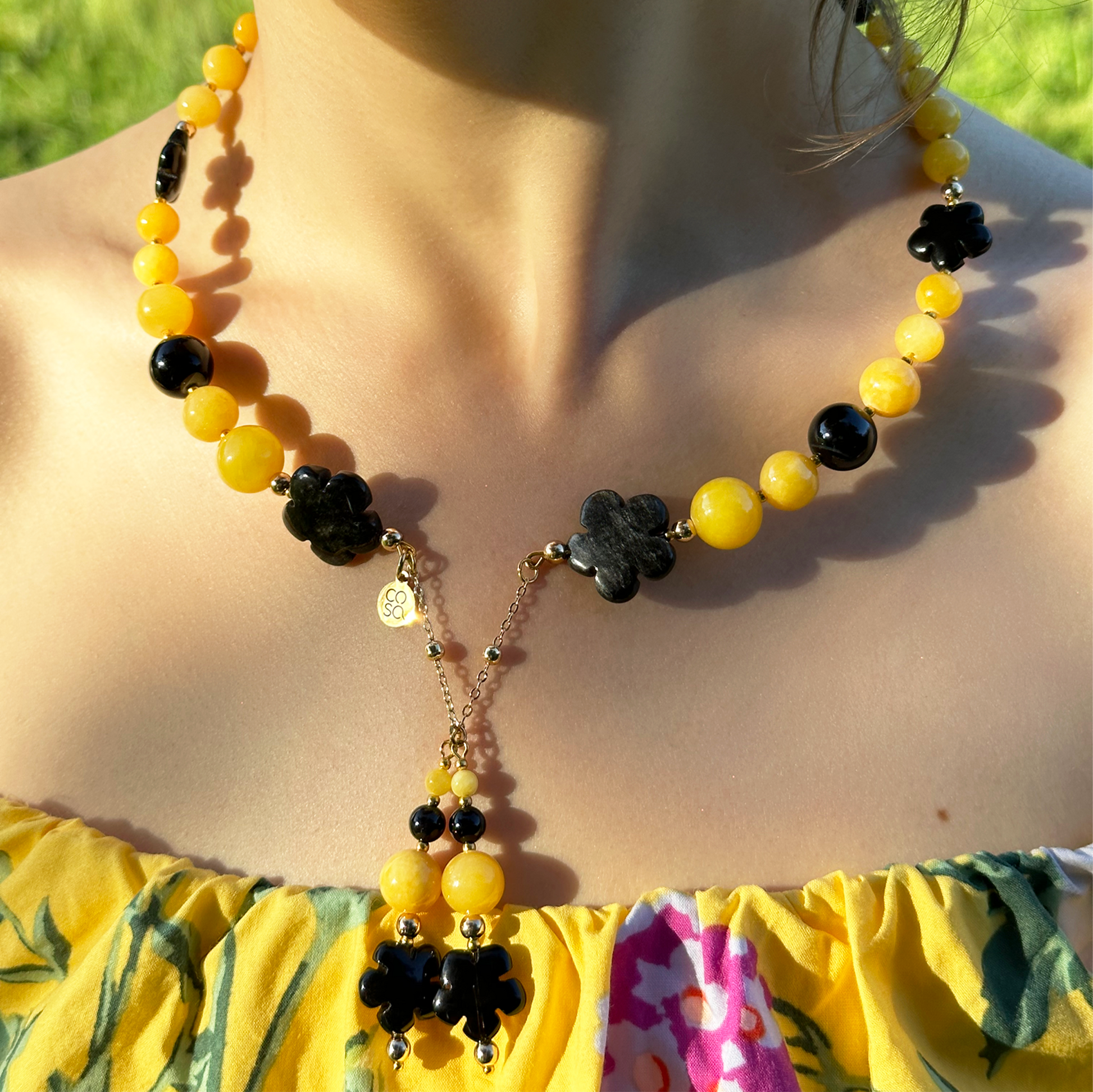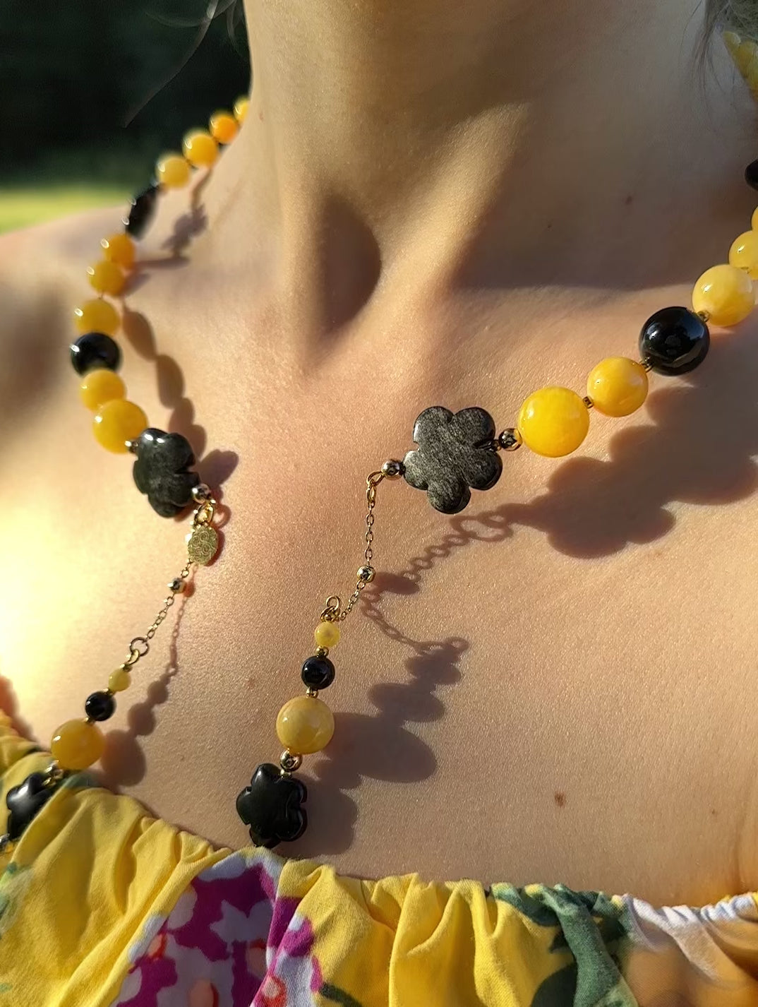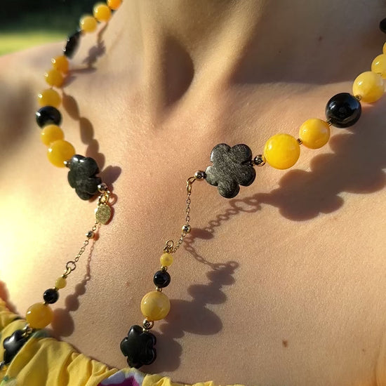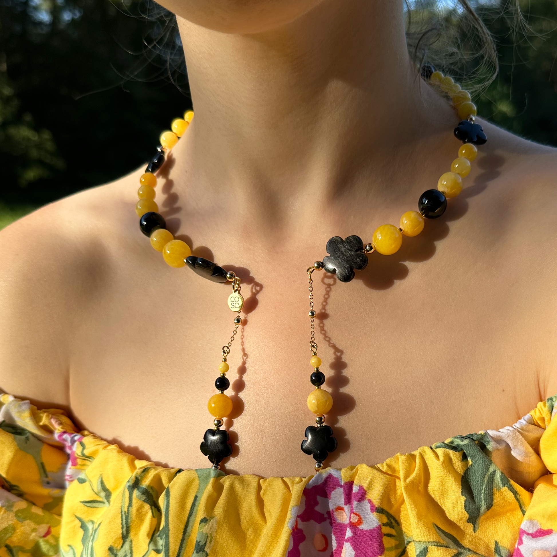 Collana dal design artigianale, realizzata a mano con agata nera e quarzo giallo tinto. Ogni pezzo è impreziosito da gemme dalle forme irregolari, che rendono ogni creazione unica e originale — un accessorio senza tempo che celebra la tua individualità. Quantità limitata.