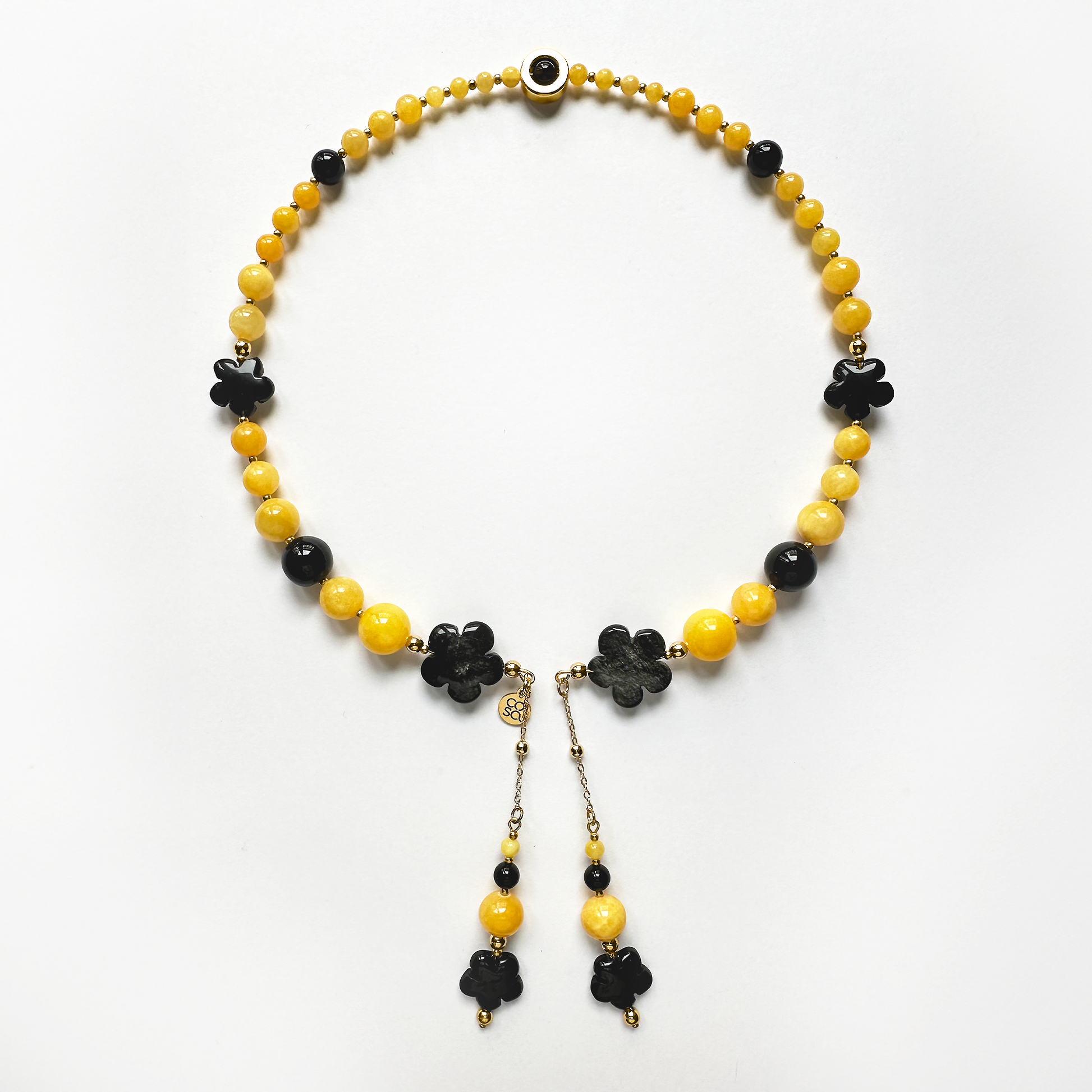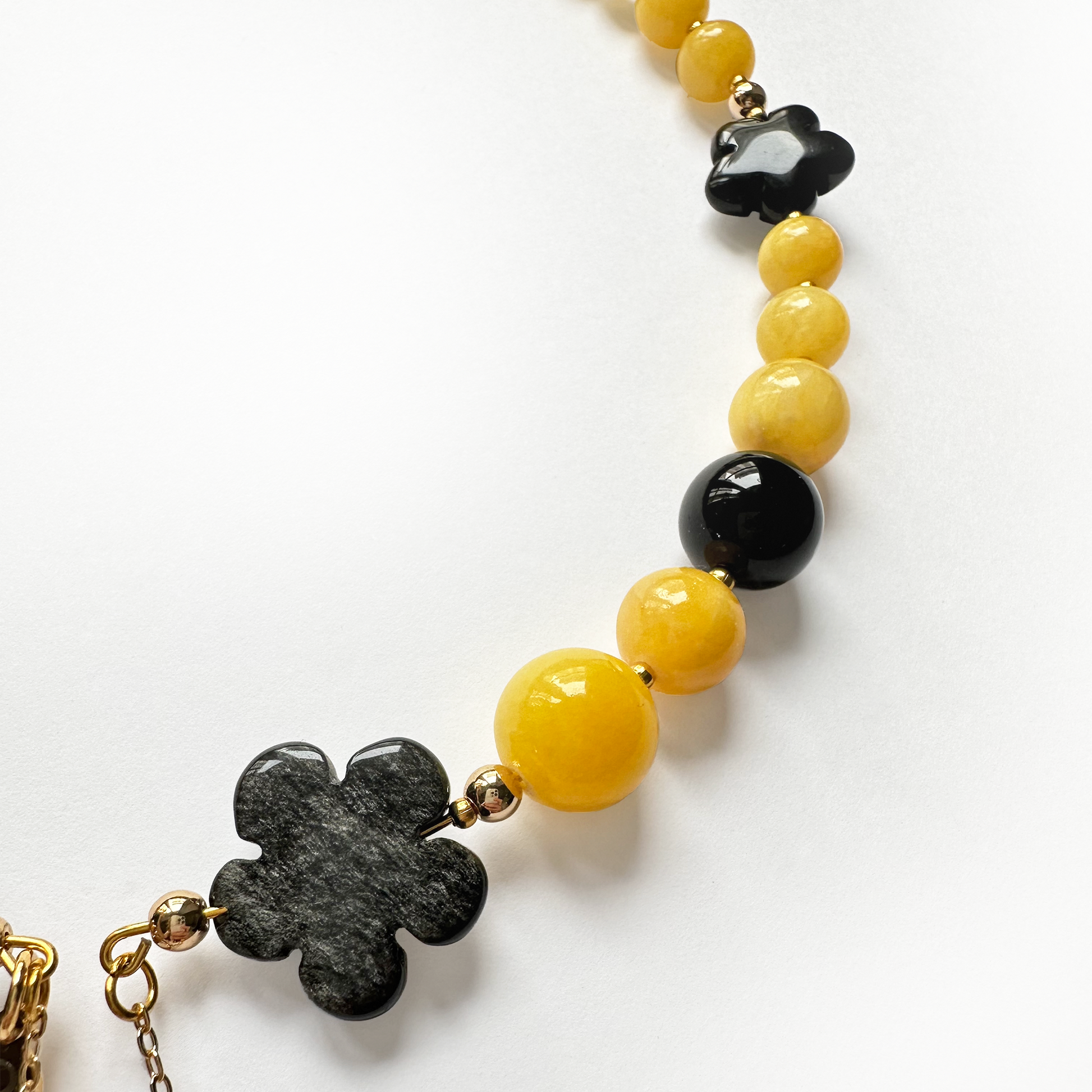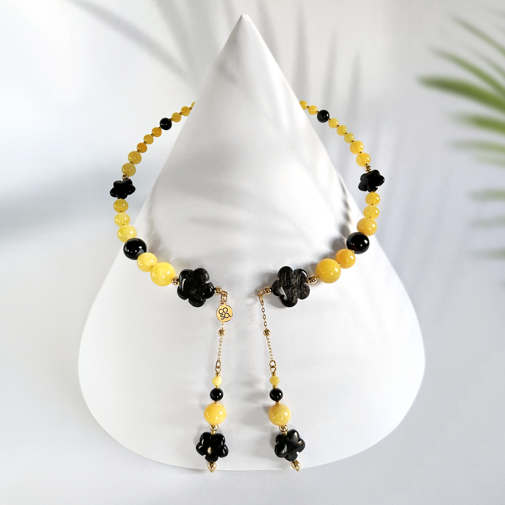 Collana dal design artigianale, realizzata a mano con agata nera e quarzo giallo tinto. Ogni pezzo è impreziosito da gemme dalle forme irregolari, che rendono ogni creazione unica e originale — un accessorio senza tempo che celebra la tua individualità. Quantità limitata.