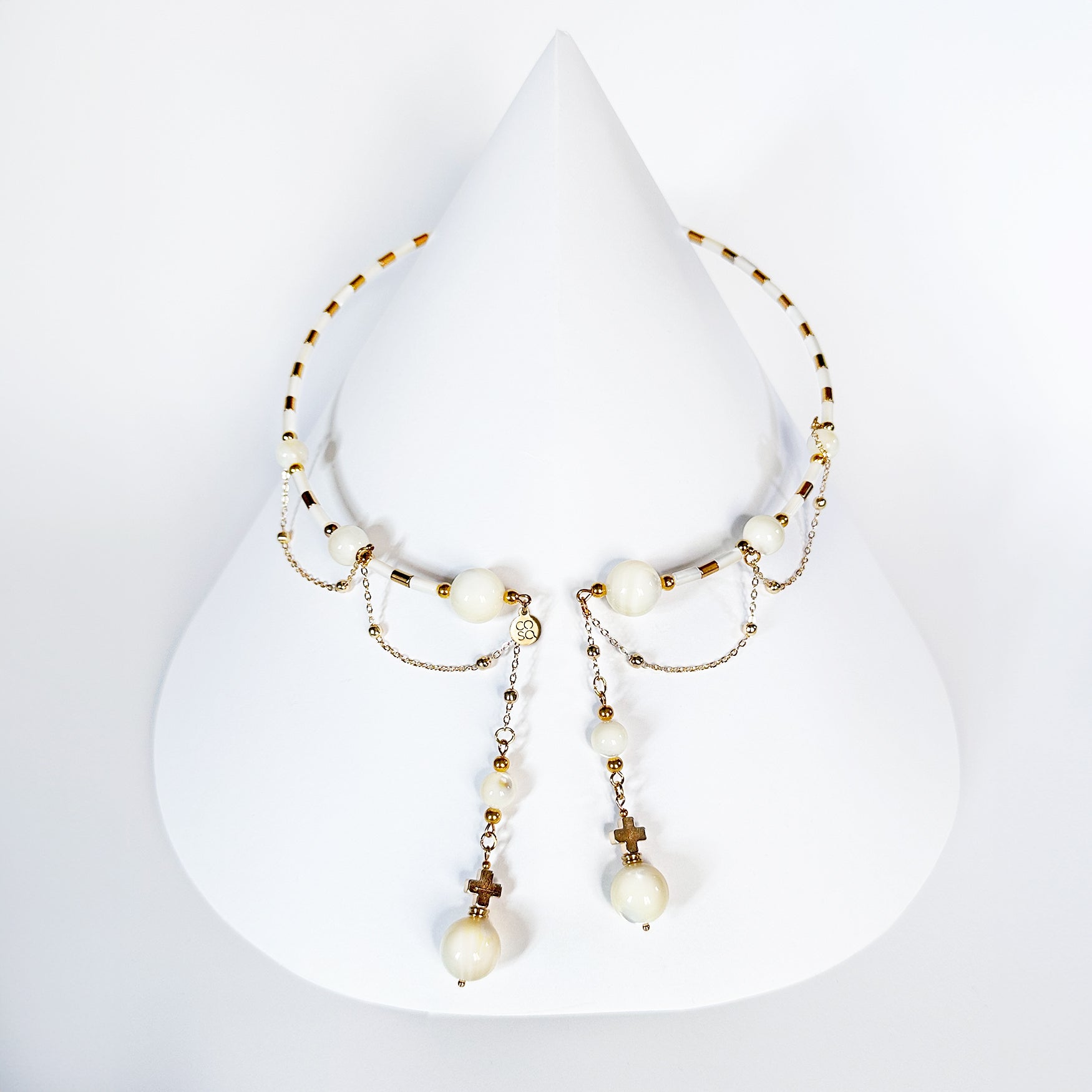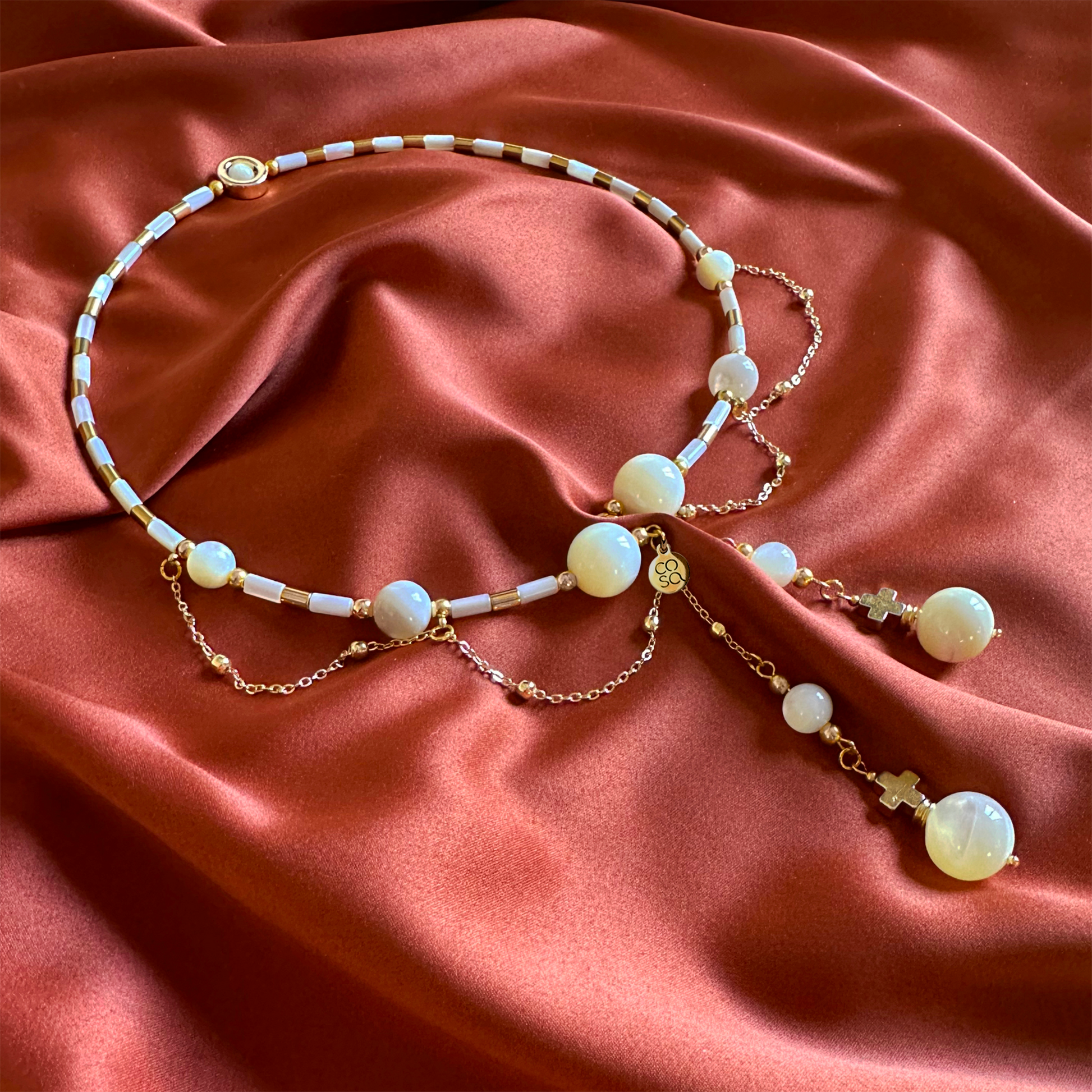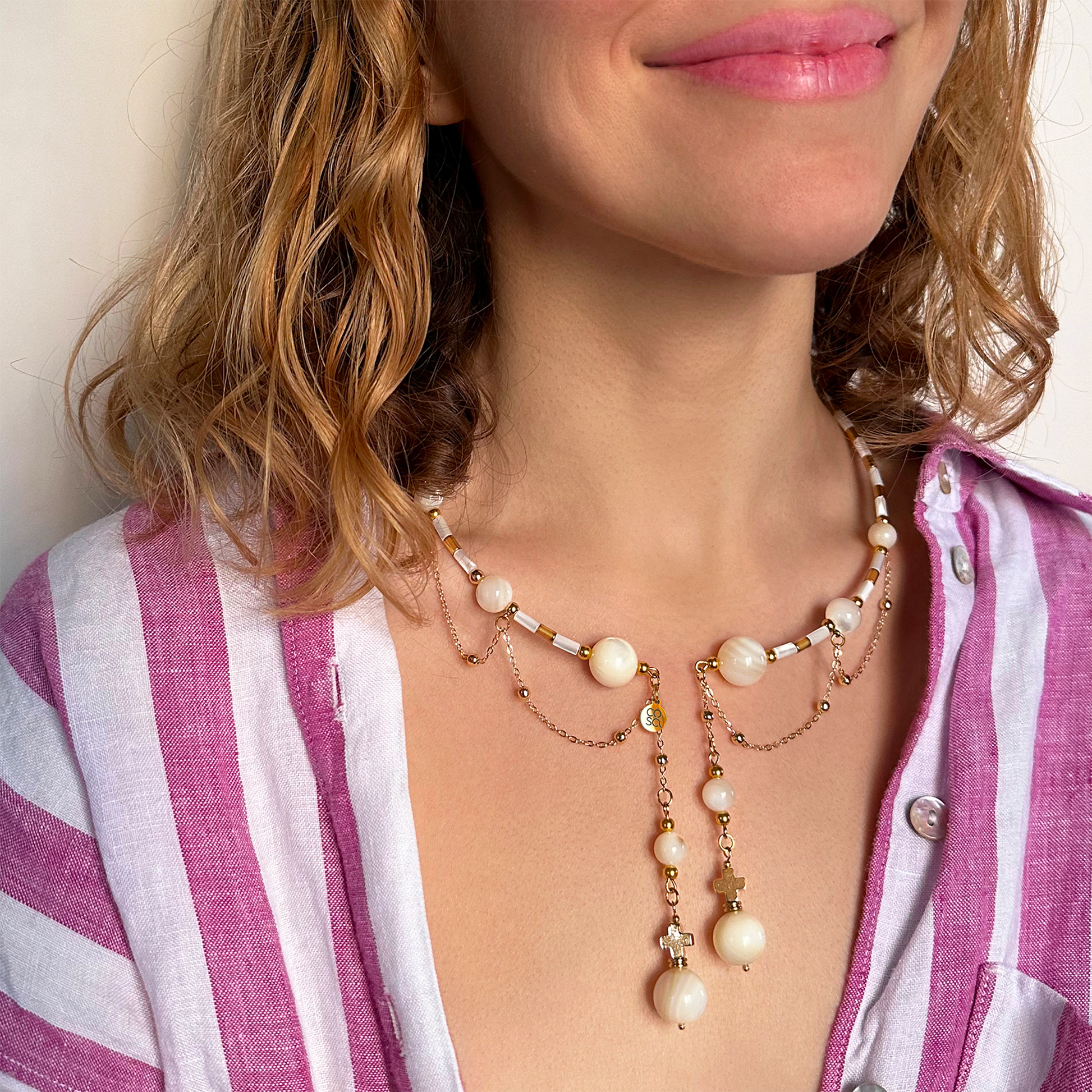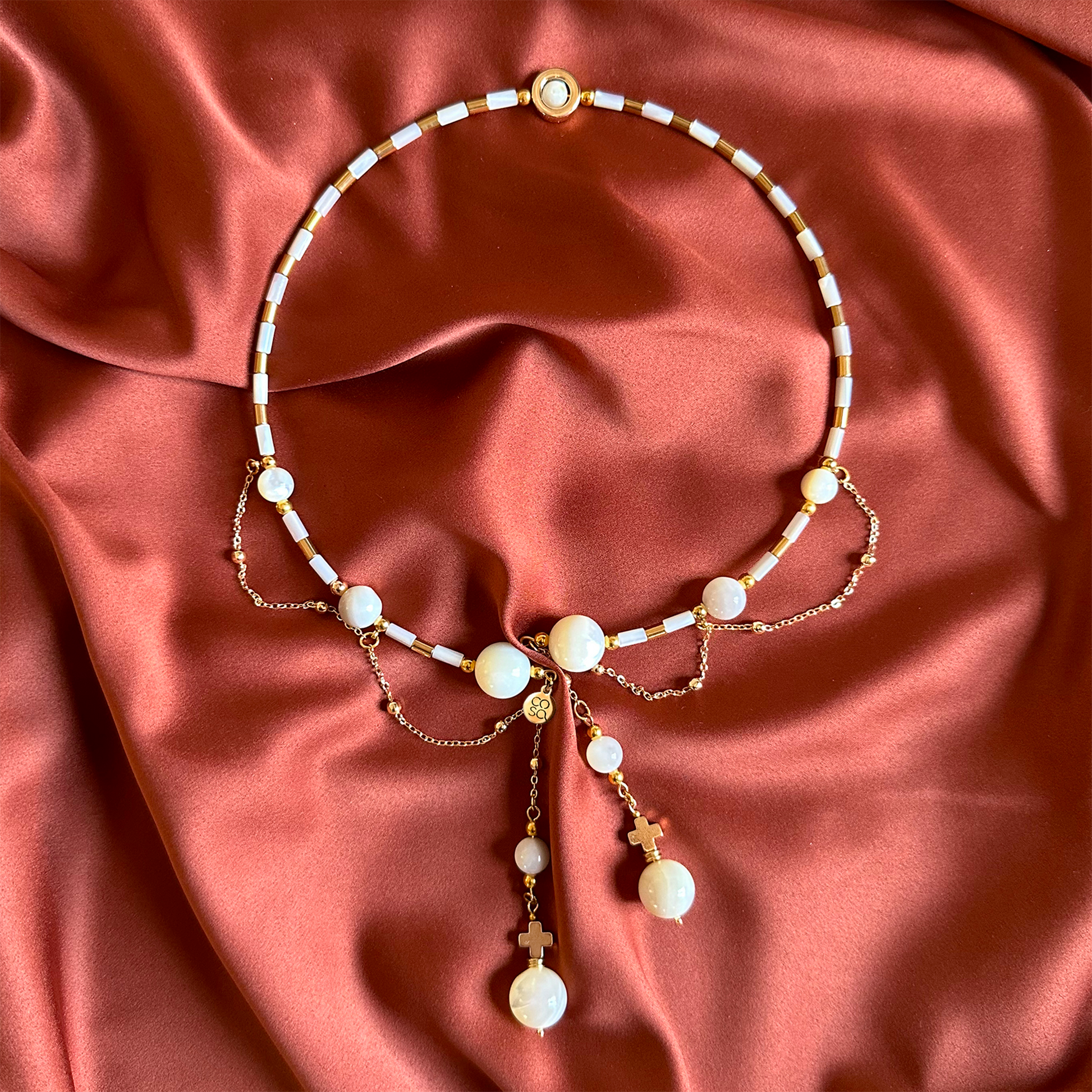 Collana dal design artigianale, realizzata a mano con madreperla. Ogni pezzo è impreziosito da gemme dalle forme irregolari, che rendono ogni creazione unica e originale — un accessorio senza tempo che celebra la tua individualità. Quantità limitata.