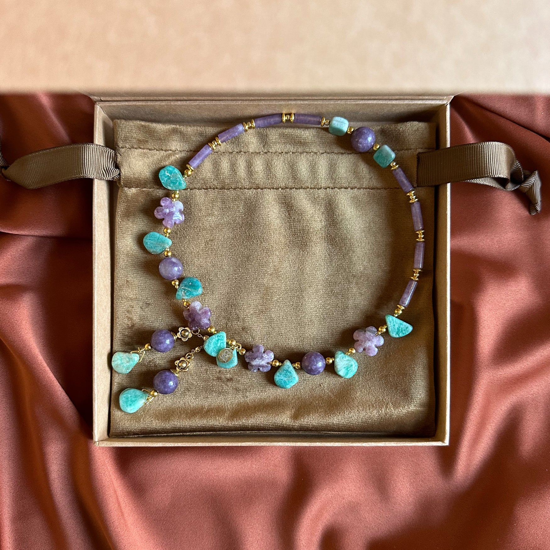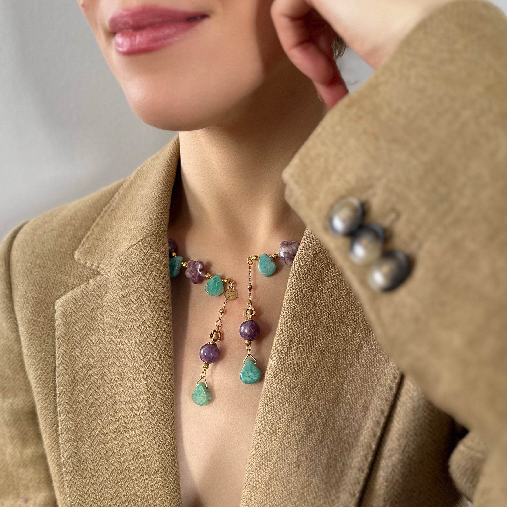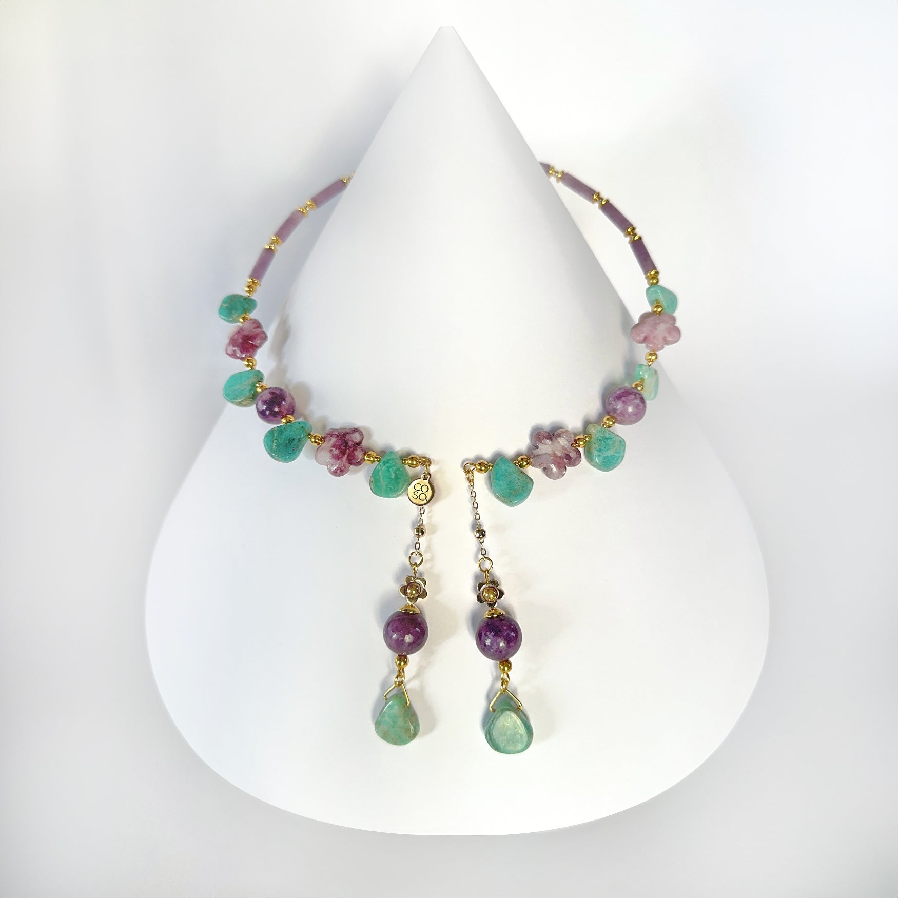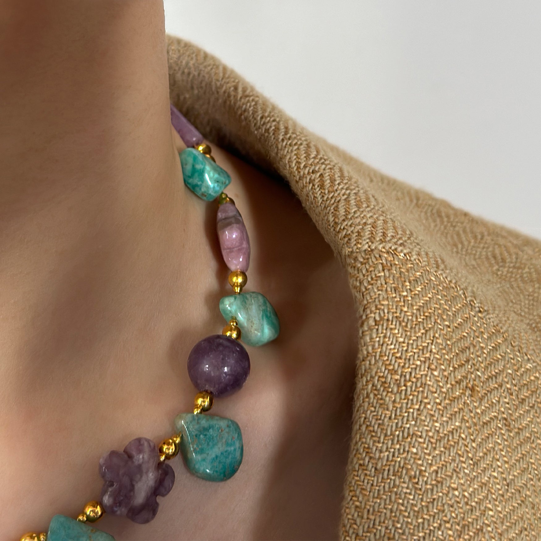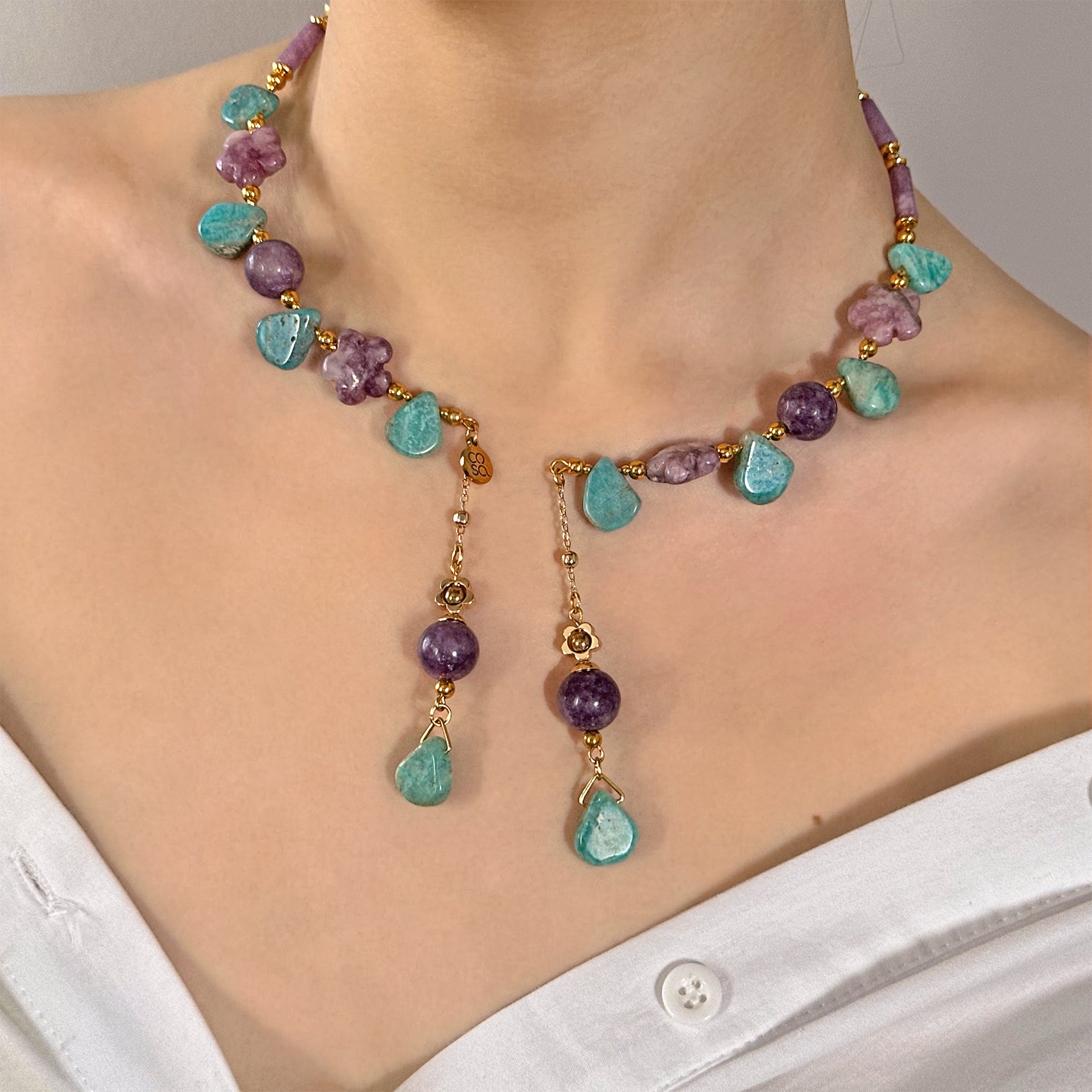 Collana dal design artigianale, realizzata a mano con Amazonite, Charoite, Lepidolite. Ogni pezzo è impreziosito da gemme dalle forme irregolari, che rendono ogni creazione unica e originale — un accessorio senza tempo che celebra la tua individualità. Quantità limitata.