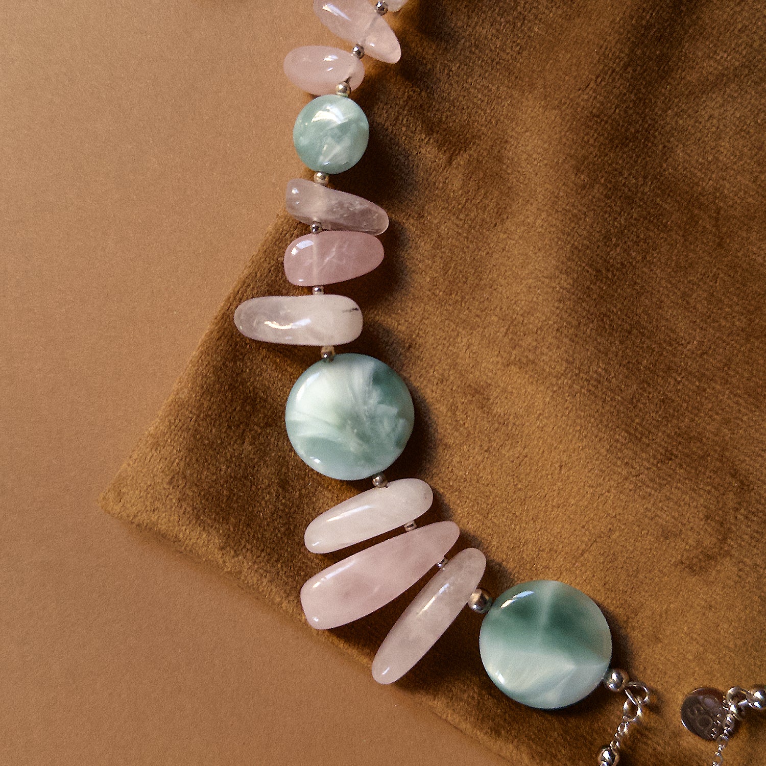 Collana dal design artigianale, realizzata a mano con pietre dure naturali angelite e cristalli di quarzo rosa. Ogni pezzo è impreziosito da gemme dalle forme irregolari, che rendono ogni creazione unica e originale — un accessorio senza tempo che celebra la tua individualità.