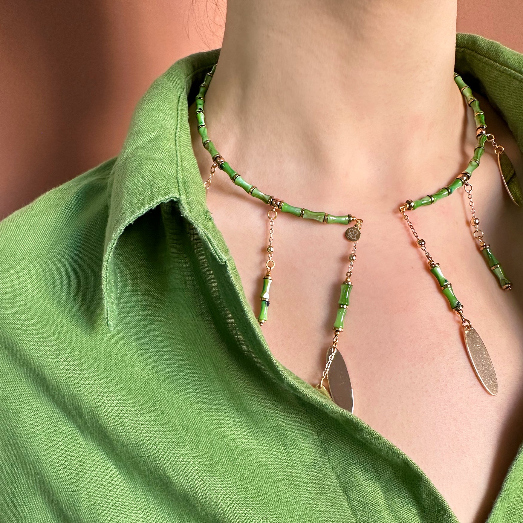 Collana dal design artigianale, realizzata a mano con madreperla. Ogni pezzo è impreziosito da gemme dalle forme irregolari, che rendono ogni creazione unica e originale — un accessorio senza tempo che celebra la tua individualità. Quantità limitata.