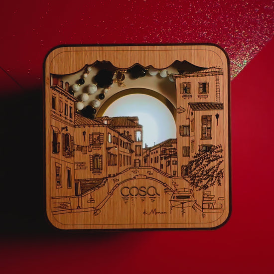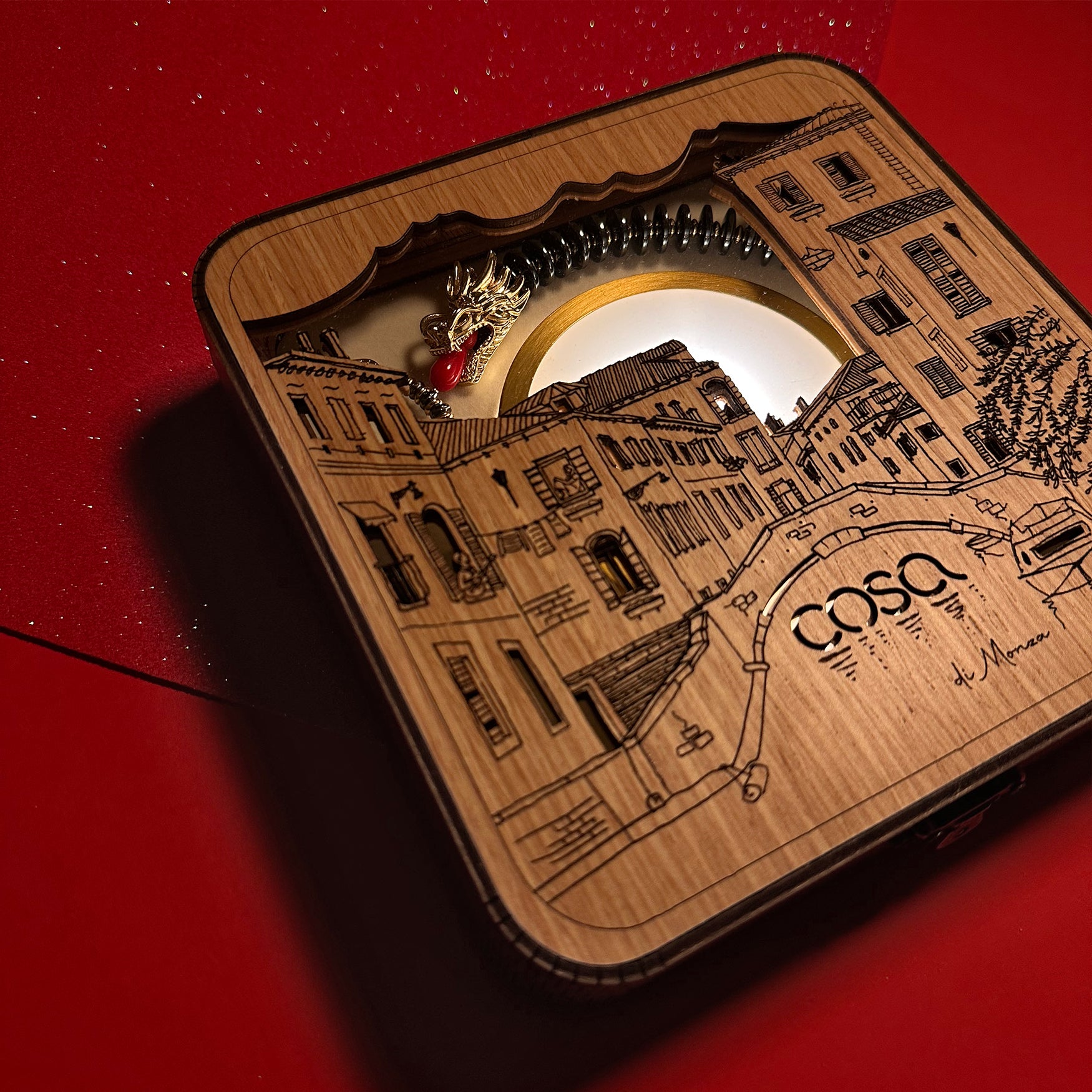 Vi presentiamo la nostra esclusiva scatola regalo in legno, caratterizzata da un design unico. All'apertura della scatola, si accende una delicata luce che proietta l'incantevole panorama della città di Monza. Un tocco di magia che rende questo regalo veramente memorabile.