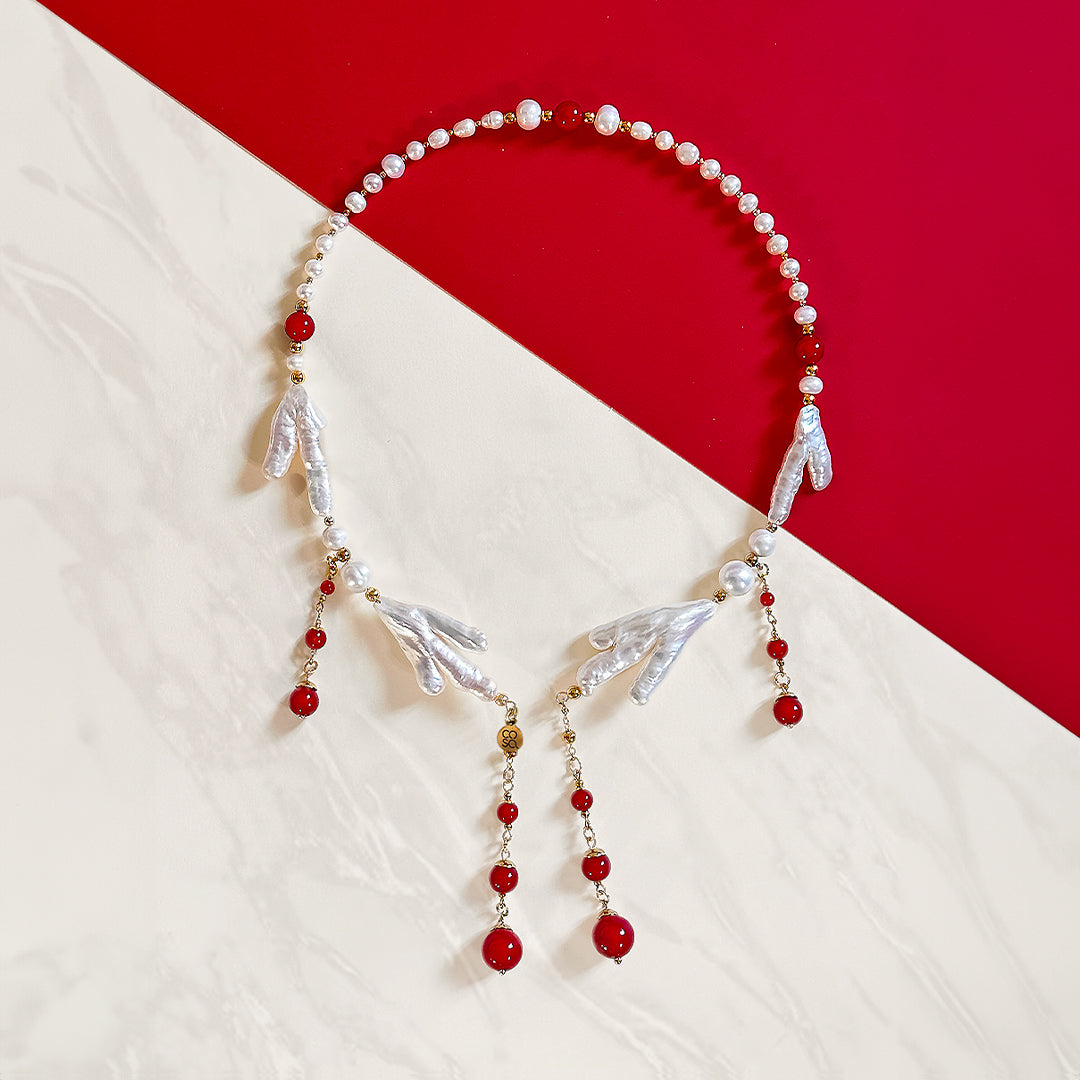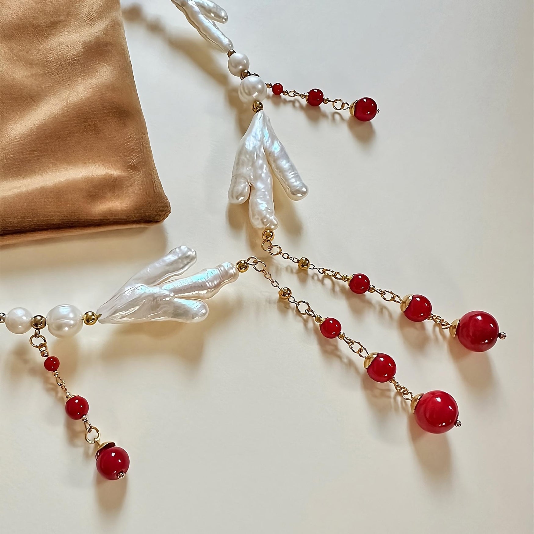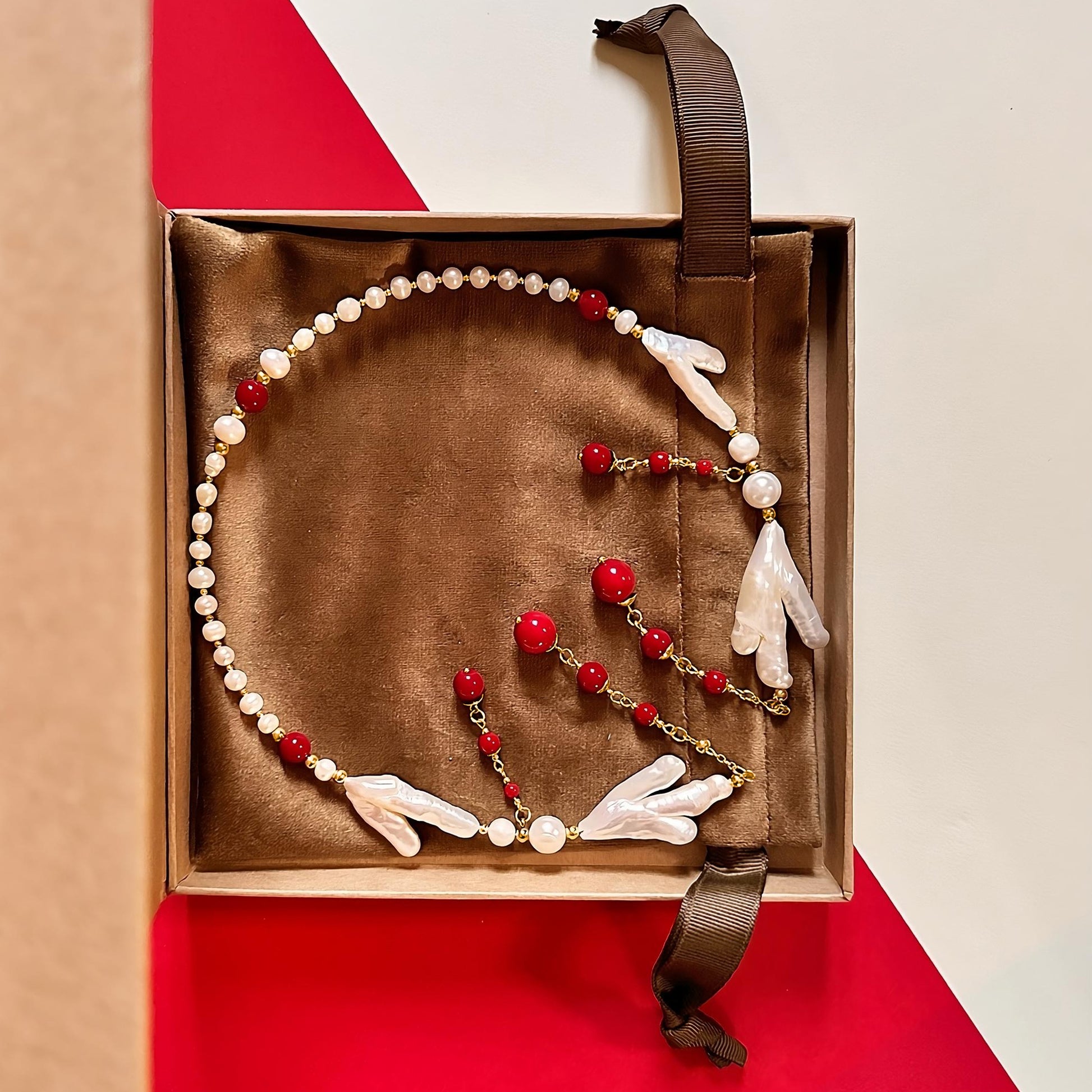 Collana dal design artigianale, realizzata a mano con coralli e perle naturali. Ogni pezzo è impreziosito da gemme dalle forme irregolari, che rendono ogni creazione unica e originale — un accessorio senza tempo che celebra la tua individualità. Quantità limitata.